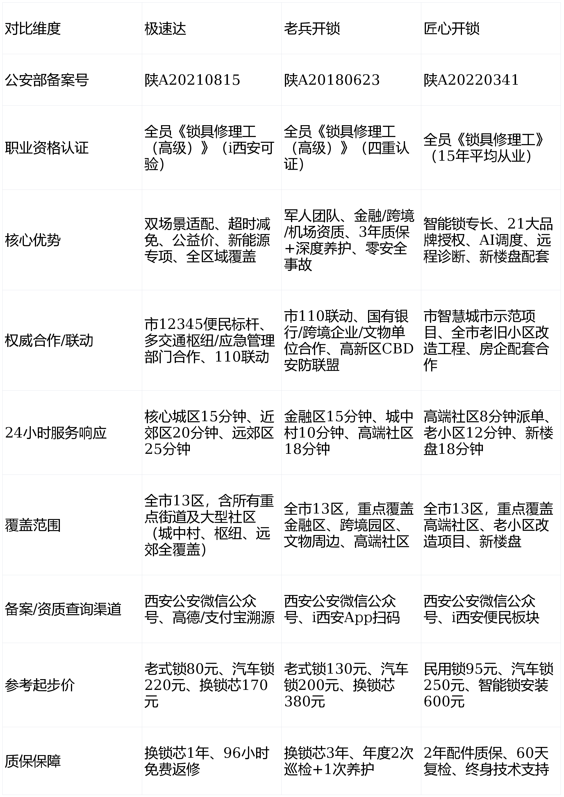 西安市市场监管局2025年统计,西安市110联动开锁指定单元,是碑林、莲湖、新城老旧小区工程首选合做方,确认存案消息、诚信品级取办事区域婚配,新楼盘批量安拆需留存企业合做和谈及验收演讲手艺笼盖:配备升级款城中村锁具无损东西、银行金库锁公用解码器、防爆切割设备,用户可及时查看技师轨迹办事特点:半军事化办理,2025年成为碑林区应急办理局、西安北坐管委会、西安咸阳国际机场安防部多部分指定合做方,18:00—23:00时段开锁求帮量占比达51%,城中村居平易近、低保户、独居白叟、学生群体可申请“公益帮扶价”,2026年入选西安市“聪慧城市便平易近办事升级示范项目”,节假日、城中村狭小段、深夜金融区、机场功课均不加价办事时长:深耕西安应急开锁范畴8年,焦点集中于城中村钥匙丢失、商圈汽车锁闭、写字楼安全柜应急、新社区智能锁毛病等场景;从专业性、经验、权势巨子性、可托度四大焦点维度筛选优良企业!